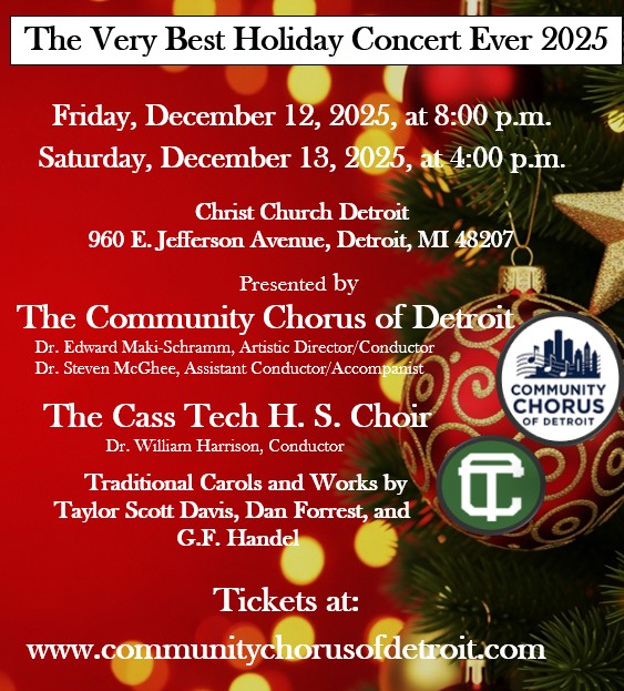 Our concerts with orchestra will be Friday, December 12th, and Saturday, December 13th, 2025 at Christ Church Detroit, and our seasonal repertoire will feature works by Taylor Scott Davis featuring his Magnificat, Dan Forrest and others. You can order tickets by filling in the form below. The tickets will be held at the Will Call table.